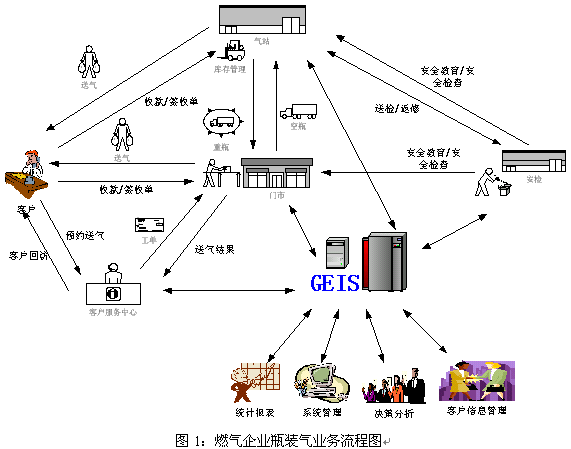 GEIS燃氣運營管理信息系統(tǒng)的應用是企業(yè)的長期發(fā)展的驅(qū)動力,它是一套以客戶服務(wù)接觸中心為龍頭、以運營生產(chǎn)流程管理為龍身、以經(jīng)營分析為龍尾的閉環(huán)信息處理系統(tǒng)。它由客戶服務(wù)中心子系統(tǒng)、門市業(yè)務(wù)子系統(tǒng)、氣站管理子系統(tǒng)、安全搶修平臺和管理與集成模塊組成。實踐的事實告訴我們,它起到保持客戶忠誠度、提升企業(yè)品牌影響力、提高業(yè)務(wù)運作效率、加快業(yè)務(wù)經(jīng)營決策和促進企業(yè)持續(xù)發(fā)展的作用。