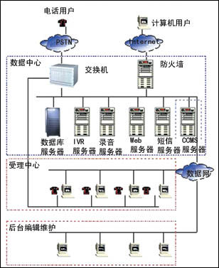 系統(tǒng)的體系結(jié)構(gòu),主要包括三個(gè)部分:數(shù)據(jù)中心、受理中心和維護(hù)中心。受理中心與數(shù)據(jù)中心之間采用E1連接,具有2M的數(shù)據(jù)通信能力;維護(hù)中心與數(shù)據(jù)中心之間采用64K DDN線路連接,三個(gè)中心分布在三個(gè)不同的地方。目前受理中心負(fù)責(zé)全省的所有業(yè)務(wù),客戶(hù)通過(guò)本地市話(huà)經(jīng)由移動(dòng)電信網(wǎng)絡(luò)將話(huà)路指向受理中心,通過(guò)數(shù)據(jù)中心的具有排隊(duì)功能的交換機(jī),根據(jù)被叫號(hào)碼和客戶(hù)服務(wù)要求,將講話(huà)路轉(zhuǎn)接到自動(dòng)臺(tái)或人工臺(tái)席,為客戶(hù)提供服務(wù)。當(dāng)用戶(hù)呼叫信息臺(tái)電話(huà)后,進(jìn)入到交換機(jī),交換機(jī)將來(lái)話(huà)消息通知驅(qū)動(dòng)池,驅(qū)動(dòng)池將相關(guān)消息轉(zhuǎn)換為標(biāo)準(zhǔn)格式,通知CCMS,CCMS根據(jù)來(lái)話(huà)被叫號(hào),根據(jù)管理系統(tǒng)的定義,啟動(dòng)相應(yīng)的IVR腳本,交給IVR解釋器解釋并由IVR服務(wù)器執(zhí)行,當(dāng)服務(wù)為自動(dòng)臺(tái)完成時(shí),由IVR服務(wù)器實(shí)現(xiàn)(如:語(yǔ)音引導(dǎo)、適合自動(dòng)服務(wù)的內(nèi)容等);當(dāng)用戶(hù)需要人工服務(wù)時(shí),CCMS管理系統(tǒng),根據(jù)用戶(hù)的服務(wù)要求,按照話(huà)路分配原則(通過(guò)管理系統(tǒng)定義),選擇最合適的話(huà)務(wù)員為其服務(wù),同時(shí)CCMS管理系統(tǒng)會(huì)將相關(guān)的頁(yè)面在話(huà)務(wù)員的臺(tái)席上顯示出來(lái),同時(shí)顯示主叫號(hào)碼以及來(lái)話(huà)標(biāo)示,當(dāng)話(huà)務(wù)員應(yīng)答后,即可開(kāi)始受理,受理的內(nèi)容通過(guò)Web服務(wù)器完成,同時(shí)對(duì)于需要查詢(xún)數(shù)據(jù)庫(kù)的訪問(wèn),通過(guò)應(yīng)用服務(wù)器,進(jìn)行數(shù)據(jù)訪問(wèn),并返回結(jié)果。當(dāng)服務(wù)完畢,本次呼叫即結(jié)束。