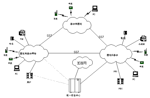 在圖中所示的組網(wǎng)圖中,包括了目前經(jīng)常使用的多種通訊方式。UMS統(tǒng)一信息系統(tǒng)在其中位于核心的位置。通過(guò)UMS,各種通訊方式具有了信息互通的轉(zhuǎn)發(fā)和接入點(diǎn),用戶可以通過(guò)任何一種通信方式接入到UMS中,從中提取或發(fā)送信息。