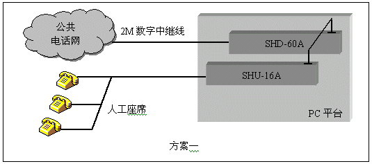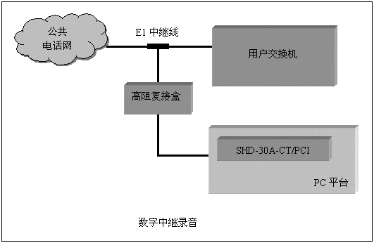 通道數(shù)較多的大中型應(yīng)用系統(tǒng),一般采用數(shù)字中繼線(xiàn)(E1)接入公共電話(huà)網(wǎng),三匯公司的SHD系列數(shù)字中繼卡可以提供相應(yīng)的解決方案。SHD系列數(shù)字中繼在一塊卡上集成了E1線(xiàn)接口,語(yǔ)音資源,信令處理等所必須的全部功能,其接入信令處理模塊可處理中國(guó)1號(hào)信令(SS1),7號(hào)信令(SS7),ISDN PRI協(xié)議(DSS1),單塊卡最多可支持4個(gè)E1接入。通過(guò)CT-BUS(或ST-BUS)總線(xiàn),還可以在數(shù)字中繼線(xiàn)上實(shí)現(xiàn)傳真功能。典型應(yīng)用結(jié)構(gòu)如下圖: