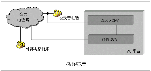 三匯公司的SHR系列監(jiān)控錄音卡可以實(shí)現(xiàn)對(duì)電話(huà)線(xiàn)路或其它信號(hào)源如話(huà)筒信號(hào)、對(duì)講機(jī)等進(jìn)行錄音。模擬線(xiàn)錄音采用高阻抗并線(xiàn)的方式,對(duì)被錄音對(duì)象無(wú)影響?梢詸z測(cè)電話(huà)線(xiàn)上直流電壓、DTMF號(hào)碼、FSK/DTMF CallerId等信號(hào)。采用配套的高阻復(fù)接盒,SHD系列數(shù)字中繼卡還能完成對(duì)數(shù)字中繼線(xiàn)的監(jiān)控錄音,并能分析線(xiàn)路上的信令,從而取得通話(huà)狀態(tài)和主被叫號(hào)碼。這兩種錄音系統(tǒng)的結(jié)構(gòu)如下圖: