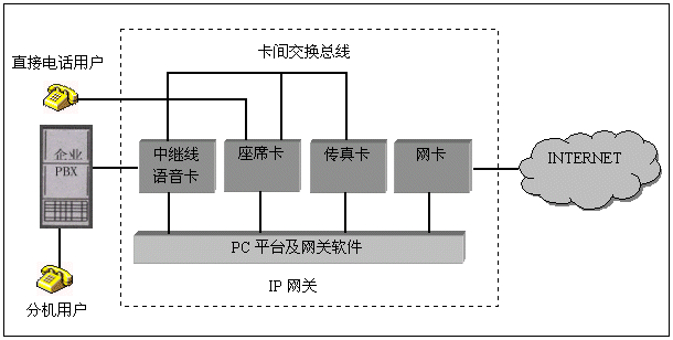 電話(huà)語(yǔ)音卡在IP網(wǎng)關(guān)中的典型應(yīng)用結(jié)構(gòu)如下: