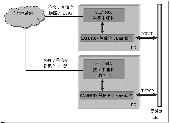 數字中繼卡上的DSP完成7號信令MTP第一至第三層的信令鏈路處理,由驅動軟件完成TUP和ISUP層的協議處理,包含有7號信令鏈路的微機作為server,通過TCP/IP協議為其它不包含信令鏈路的client提供接續(xù)控制。