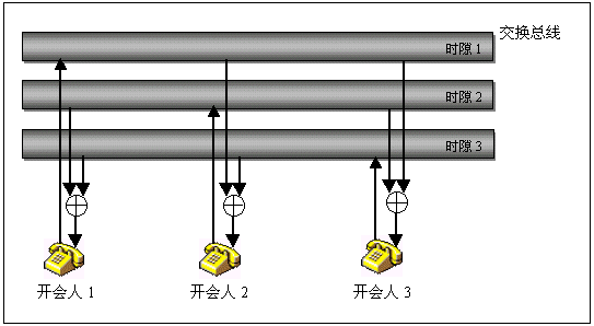 由于會議的資源是分布在各個通道,因此電話會議功能可以具有極大的靈活性,只有一塊卡的小系統(tǒng)也可以擁有電話會議功能,既可以召開所有通道參加的大會議,也可以同時召開一系列參加人數不同的小會議,會議功能的各項指標,如會議數目,會議參加人數,發(fā)言人數等基本上都不受限制。下圖以一個三方會議的實現說明分布式電話會議的概念。