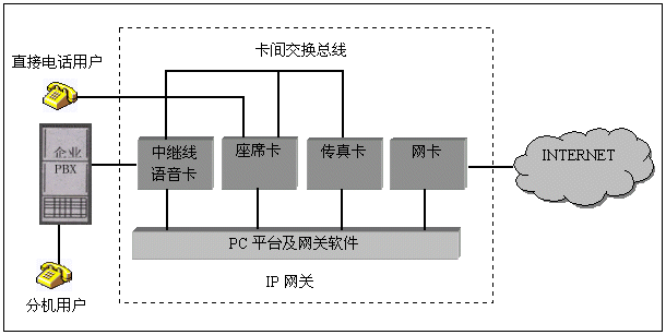 在PC機平臺內,可插入三種不同類型的語音卡,中繼卡用于連接企業(yè)原有的用戶交換機,使得分機用戶可以通過IP網絡接打電話,中繼線可采用模擬線或數字中繼線、座席卡用于直接連接電話用戶,常用于沒有用戶交換機的場合;傳真卡用于完成IP網絡上的傳真中繼功能。所有的語音卡之間采用卡間交換總線相連,以便實現互相通話和傳真資源共享。PC平臺內一般還需要網卡實現與INTERNET的連接。網關軟件是該IP網關的關鍵部分,完成對語音卡的控制和IP協議處理。