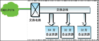 在圖1中,系統(tǒng)擁有一個(gè)64方、兩個(gè)32方共三組會(huì)議資源,也就是說,這個(gè)系統(tǒng)最多可同時(shí)召開一個(gè)64方會(huì)議和兩個(gè)32方會(huì)議。由于各會(huì)議組之間無法共享資源,所以既不能召開所有話路均參加的大會(huì),也不能同時(shí)召開大量的小型會(huì)議。