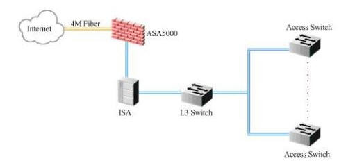 辦公專用網(wǎng)通過一條4M光纖線路連入CNC網(wǎng)絡(luò),在酒店內(nèi)部安裝了ASA5000和ISA等安全管理設(shè)備,ISA承擔(dān)了NAT等功能;辦公網(wǎng)的信息點數(shù)量大概在200個左右。