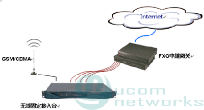 本方案采用FXO中繼語音網(wǎng)關接入互聯(lián)網(wǎng),由當?shù)仄胀M電話線路落地對接網(wǎng)關FXO口,采用電話卡綁定網(wǎng)關預付費計費實現(xiàn)運營。落地線路接入可以使用本地固定PSTN線路,也可以轉制無線電話,采用固定臺接入,2種拓撲圖如下所示。
