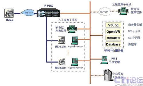 - 遠程坐席:功能同本地坐席一樣,運行AgentBrowser模塊,通過數(shù)據(jù)專網(wǎng)同呼叫中心系統(tǒng)通信。