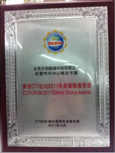 CTI論壇(ctiforum)1月13日消息(記者 潘婷婷): 近日, CTI論壇舉辦的“CTI論壇2011年度編輯推薦獎(jiǎng)”評選活動落下帷幕,天潤融通的解決方案成功斬獲了CTI論壇編輯推薦獎(jiǎng)。