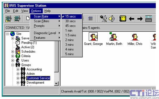 同時IRIS還可對座席工作的狀態(tài)進(jìn)行分組實時監(jiān)控或監(jiān)聽、可直觀的了解的座席的狀態(tài)(離席、入席、電話中、電話待命中、已規(guī)劃中);可對座席人員進(jìn)行人員跟蹤的實時監(jiān)聽。