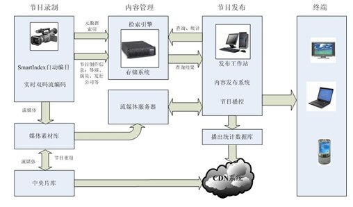 節(jié)目制作平臺主要負(fù)責(zé)節(jié)目的采編,接收節(jié)目源的數(shù)字視頻信號和模擬視頻信號進行實時/超實時的轉(zhuǎn)碼,并同時進行自動編目、歸檔,滿足系統(tǒng)不同應(yīng)用的要求。另外,各資源建設(shè)成員單位或各地、州、市遠程辦按照省遠程辦的統(tǒng)一部署,加工各自類別的課件,采用人工傳送介質(zhì)或利用VPN實現(xiàn)專網(wǎng)的方式送交到資源庫系統(tǒng)中,實施統(tǒng)一的存儲和管理。