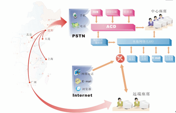 對于地區(qū)分布廣泛,而又要集中管理的企業(yè),可在各個局部地區(qū)設(shè)置遠(yuǎn)端座席,并通過網(wǎng)絡(luò)方便的接入中心系統(tǒng)。我們?yōu)檫h(yuǎn)端座席提供與中心座席完全相同的操作,遠(yuǎn)端座席可以根據(jù)各個地區(qū)的特定情況有針對性的處理各個局部地區(qū)的業(yè)務(wù),為中心分流壓力,同時中心系統(tǒng)也可以完全掌握遠(yuǎn)端座席的情況。我們可以非常明確的一點(diǎn)是:采用分布式座席的技術(shù),使得遠(yuǎn)端座席與中心座席除了地域上的差異,其它部分完全相同?梢哉f只要網(wǎng)絡(luò)無極限,座席分布就是無極限的。