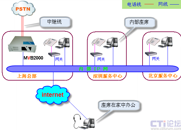 在技術(shù)上,MVB2000 的語(yǔ)音業(yè)務(wù)通過電信運(yùn)營(yíng)商的模擬或者數(shù)字中繼線路接入,數(shù)據(jù)業(yè)務(wù)都通過局域網(wǎng)或者互聯(lián)網(wǎng)使用TCP/IP協(xié)議傳送,解決了呼叫中心中大量數(shù)據(jù)傳送的需求,請(qǐng)看下面的網(wǎng)絡(luò)組織結(jié)構(gòu)圖: