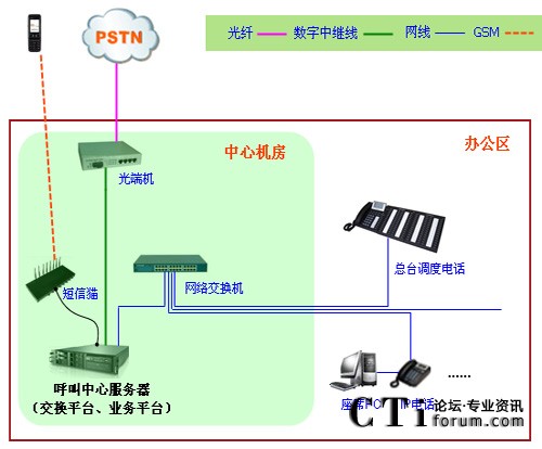 維佳元?jiǎng)?chuàng)呼叫中心系統(tǒng)采用暢信達(dá)通信呼叫中心交換平臺與業(yè)務(wù)平臺,采用1路E1數(shù)字中繼線接入,對外公布一個(gè)400號碼與10多個(gè)辦公電話號碼,采用IP話機(jī)作為總臺調(diào)度電話、座席電話與辦公電話,系統(tǒng)架構(gòu)形式如下: