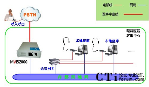 醫(yī)院采用暢信達通信MVB2000系統(tǒng)作為交換平臺,采用1路E1數字中繼線接入,對外公布統(tǒng)一的外線呼入號碼,采用語音網關結合話機作為座席終端,前期投入8位人工座席,系統(tǒng)架構形式如下: