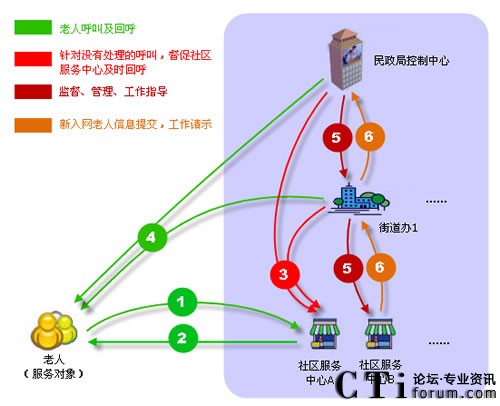 根據(jù)社區(qū)內(nèi)老人的情況,為加入社區(qū)呼叫系統(tǒng)(以下簡稱入網(wǎng))的老人發(fā)放老人專用手機(jī),并將采集到的老人檔案信息上傳于系統(tǒng)內(nèi)。當(dāng)老人通過手機(jī)固定一個撥號鍵撥打“服務(wù)中心服務(wù)統(tǒng)一電話號碼”時,社區(qū)呼叫平臺根據(jù)老人所在位置將來電直接轉(zhuǎn)給對應(yīng)社區(qū)服務(wù)中心,社區(qū)服務(wù)中心的座席電腦上就會彈出老人信息(包括:名字、地址、聯(lián)系電話、兒女親屬電話、所在街道的社區(qū)、有無病史、歷史需求記錄等等)。