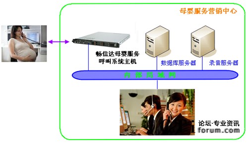 暢信達母嬰服務(wù)呼叫系統(tǒng)是以母嬰服務(wù)呼叫系統(tǒng)主機為呼叫交換和業(yè)務(wù)受理平臺,選配數(shù)據(jù)庫服務(wù)器和錄音服務(wù)器,采用人工座席發(fā)起呼叫并接聽來電,系統(tǒng)架構(gòu)圖如下:
