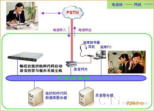 該系統(tǒng)以提高代碼辦服務(wù)質(zhì)量、完善服務(wù)措施為出發(fā)點,利用先進(jìn)的計算機(jī)網(wǎng)絡(luò)和電話通信技術(shù),實現(xiàn)了自動語音咨詢、自動電話通知、自動短信通知等功能。用戶通過撥打咨詢電話就能實現(xiàn)自動語音咨詢,通過按鍵進(jìn)入自動語音引導(dǎo)、自動語音播放、通話錄音、轉(zhuǎn)人工等服務(wù)。管理員還可以通過電腦網(wǎng)絡(luò)遠(yuǎn)程操控管理系統(tǒng),使用自動外呼電話或自動發(fā)送短信的方式,向指定用戶發(fā)送代碼業(yè)務(wù)的相關(guān)提前告知信息。