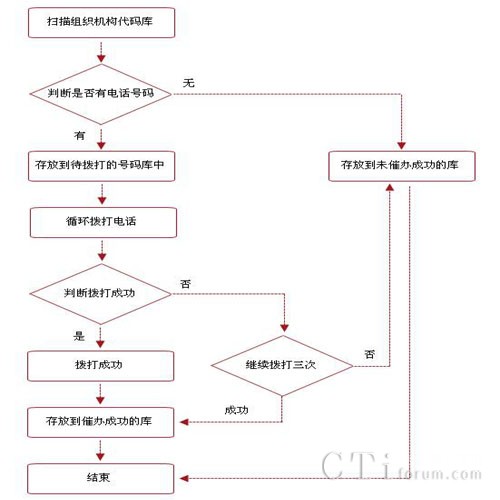 催辦業(yè)務(wù)負(fù)責(zé)完成語音提示。系統(tǒng)自動掃描組織機(jī)構(gòu)代碼庫,查詢當(dāng)日需要年檢的組織機(jī)構(gòu)代碼信息,對沒有電話號碼的存入到未催辦的組織機(jī)構(gòu)代碼庫中,有電話號碼的存入到待催辦的電話號碼庫中,并根據(jù)設(shè)置的時間撥打手機(jī)號碼,對于語音提示成功的,存放到相應(yīng)的庫中。催辦業(yè)務(wù)后臺功能包括: