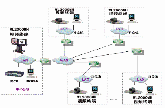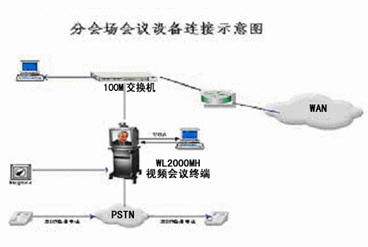 分會場配置WL-2000MH會議終端,具有快速以太網LAN接口,在H.323上可達到4M。實際應用中,分會場工作速率在512K-2M自適應可調。中心會場可通過局域網對分會場設備遠程管理。終端通過RS232口連接攝像機,中心會場可進行遙控分會場的攝像機,注本地也可以進行攝像機控制。WL-2000MH會議終端有兩路視頻輸出,一路為遠端視頻,一路為本地視頻,分會場可選擇兩個顯示設備如大屏幕彩電或背投電視。