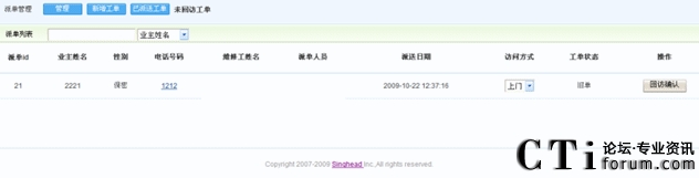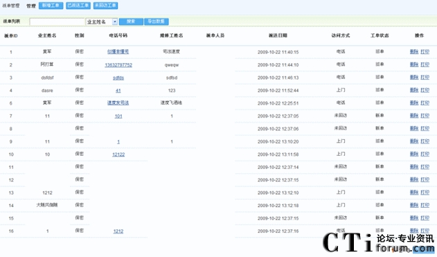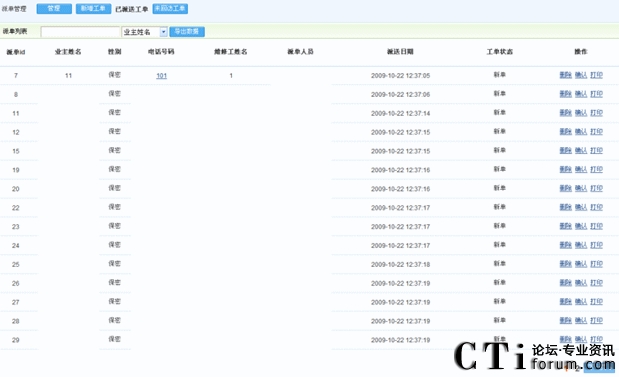 派單管理:包含了業(yè)主姓名、電話、地址、維修工程師、工單狀態(tài)等(如下圖):