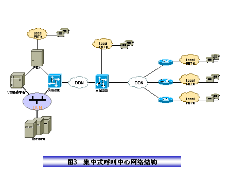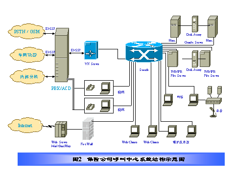 某保險(xiǎn)公司電話(huà)中心采取全國(guó)集中服務(wù)方式,其結(jié)構(gòu)如圖2所示,在電話(huà)呼叫中心集中管理所有人工語(yǔ)音坐席和電話(huà)中心運(yùn)行所需的所有業(yè)務(wù)數(shù)據(jù)、語(yǔ)音文件和硬件設(shè)備,服務(wù)全國(guó)。我們?cè)O(shè)計(jì)的方案具有如下特點(diǎn):