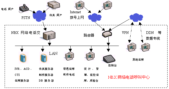 呼叫中心一般又稱為客戶服務(wù)中心,指企業(yè)或團體通過公開一個電話特服號碼(如:12315、95000等),提供對客戶的電話服務(wù)。NBX網(wǎng)絡(luò)電話呼叫中心是基于3Com 公司NBX網(wǎng)絡(luò)電話交換機平臺構(gòu)筑的新一代語音、數(shù)據(jù)兩網(wǎng)合一的統(tǒng)一呼叫中心系統(tǒng),支持統(tǒng)一消息服務(wù),統(tǒng)一外部訪問路由,是各類傳統(tǒng)呼叫中心的升級換代產(chǎn)品。