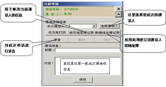 如果有電話打入時(shí),在屏幕的右側(cè)會(huì)彈出一個(gè)對(duì)話框,它顯示了當(dāng)前來電的號(hào)碼和通話人(如果在地址簿中沒有記錄則顯示為未知),點(diǎn)擊彈出全部菜單功能,它相當(dāng)于一個(gè)功能強(qiáng)大的通話記事本,用它既可以邊接聽電話邊整理相關(guān)通話的文字記錄,又可以錄下通話的全部內(nèi)容。如果這個(gè)電話是您不愿接聽的,也可以將它設(shè)置為“免打擾”,這樣,這個(gè)號(hào)碼以后將存入免打擾名單中,若此號(hào)碼再呼入,系統(tǒng)將自動(dòng)掛斷此呼叫。如果這個(gè)電話是您認(rèn)為的重要客戶打過來的,您也可以將此號(hào)碼添加到重要客戶組中,以便您今后接聽或設(shè)置電話轉(zhuǎn)移時(shí)能與其它呼入電話相區(qū)分。