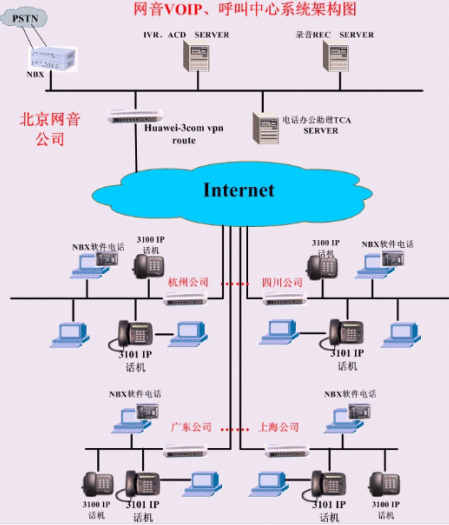 網(wǎng)音公司作為NBX產(chǎn)品總代,與全國各地的分銷公司之間建立一套網(wǎng)絡(luò)電話通訊系統(tǒng),本系統(tǒng)包括各公司之間的IP電話互通、分步式呼叫中心、NBX電話辦公助理、錄音等多種業(yè)務。