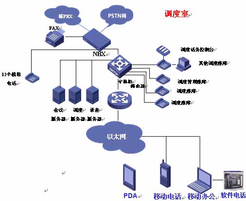 北京市交通應(yīng)急指揮中心,此次項(xiàng)目采用了1500個(gè)設(shè)備容量的華為3Com V3000 NBX系統(tǒng)一臺(tái)為核心語(yǔ)音調(diào)度交換機(jī),連接PSTN網(wǎng)。使用3101標(biāo)準(zhǔn)版IP智能話機(jī)、3102商務(wù)版IP智能話機(jī)和3105話務(wù)臺(tái)總數(shù)量達(dá)到了34部。在已有的網(wǎng)絡(luò)結(jié)構(gòu)中實(shí)施語(yǔ)音系統(tǒng),減少對(duì)網(wǎng)絡(luò)基礎(chǔ)設(shè)施的投資,節(jié)省話路設(shè)備成本、電話系統(tǒng)安裝、維護(hù)和使用管理,還可提供更多的通信業(yè)務(wù)和更強(qiáng)的智能語(yǔ)音功能。結(jié)構(gòu)圖如下: