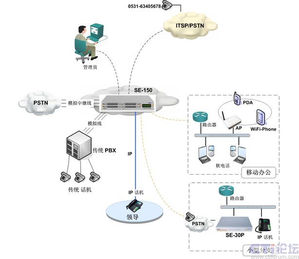 IP PBX即是專為中小企業(yè)量身設(shè)計的,其中典型產(chǎn)品為SE150。