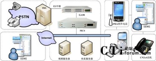 1)由MCS與該企業(yè)原有的大型傳統(tǒng)PBX進(jìn)行對(duì)接,MCS主要處理語音交換,具備IP-PBX和VOIP網(wǎng)關(guān)的功能,還具有IVR(交互式語音應(yīng)答)和ACD(自動(dòng)呼叫分配)等呼叫中心功能,并為SEME提供服務(wù)。