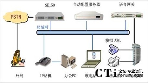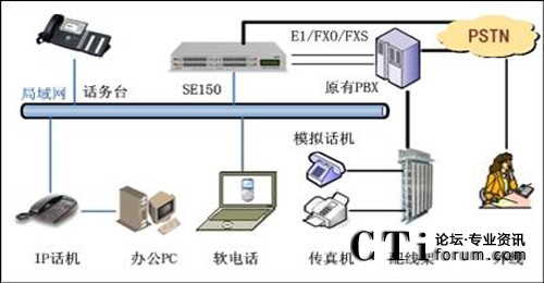 中小型企業(yè)語音通信系統(tǒng)集IP-PBX、語音網(wǎng)關、互聯(lián)網(wǎng)網(wǎng)關等多種功能于一身,可以兼容傳統(tǒng)PBX的全部功能,同時也可作為VoIP網(wǎng)關使用,把基于IP的SIP通訊轉(zhuǎn)換成PSTN通訊。通過采用開放的標準協(xié)議,系統(tǒng)(SE150)可以兼容眾多國際、國內(nèi)IP電話、語音網(wǎng)關廠家的產(chǎn)品。