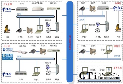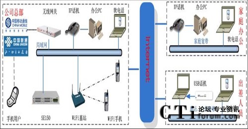 此方案適用于具有“移動辦公、頻繁出差、家庭辦公”需求的企業(yè)。系統(tǒng)要求企業(yè)內(nèi)部部署好數(shù)據(jù)網(wǎng)絡,如果采用模擬終端,則企業(yè)的各個辦公點需要先將網(wǎng)絡線路和電話線路部署到位。如果需要應用WIFI終端,則需要部署WIFI網(wǎng)絡。