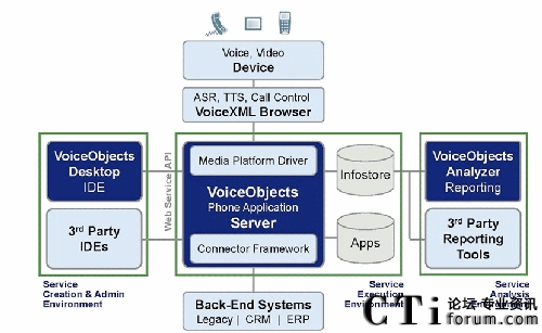 VoiceObjects體系結(jié)構(gòu)支持輕松地開(kāi)發(fā)、部署和維護(hù)帶有語(yǔ)音、視頻、文本和移動(dòng)互聯(lián)網(wǎng)接口的電話應(yīng)用。通過(guò)緊密集成提供實(shí)時(shí)分析的VoiceObjects分析器和提供應(yīng)用創(chuàng)建與維護(hù)的VoiceObjects桌面,VoiceObjects服務(wù)器成為提供動(dòng)態(tài)對(duì)話和接口生成的執(zhí)行引擎。