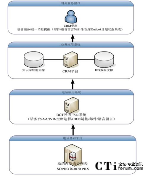 原先電話系統(tǒng)與CRM系統(tǒng)是獨(dú)立的兩個(gè)系統(tǒng),客服人員面對大量的客戶,迅速的獲悉來電客戶的身份、背景資料以及歷史資料在很大程度上決定了其服務(wù)質(zhì)量。BCT呼叫中心系統(tǒng)位于PBX與CRM之間,作為一個(gè)中間的橋梁,對PBX送來的電話信息或者用戶輸入的卡號等數(shù)據(jù)進(jìn)行處理分析,對主叫號碼或用戶輸入卡號進(jìn)行識別后,傳遞給CRM;CRM檢索與其相連的HIS(醫(yī)院信息系統(tǒng))的數(shù)據(jù)庫,將客戶資料以及相關(guān)的歷史記錄通過彈出網(wǎng)頁的模式,同步的顯示在坐席的計(jì)算機(jī)上,方便客服代表的輸入和后續(xù)操作,提高了效率與正確率。同時(shí),客戶代表還可以在CRM頁面中點(diǎn)擊電話號碼,通過BCT發(fā)起電話呼叫來聯(lián)系客戶,來處理用戶回訪等工作。
