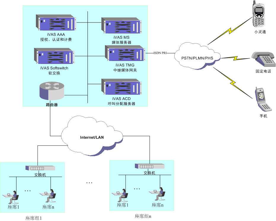 - iVAS Agent:人工座席,可以采用IAD+普通的電話,或者SoftPhone方式接聽來電