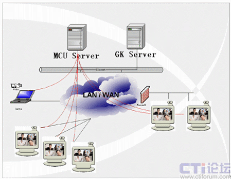 當(dāng)召開多點(diǎn)的交互式會(huì)議時(shí)則需要MCU(多點(diǎn)控制器)的參與。MCU的作用類似于交換機(jī),主要完成各會(huì)場(chǎng)圖像的切換和語音的混音功能,一般放置在主會(huì)場(chǎng)。在MCU的控制下可以實(shí)現(xiàn)語音激勵(lì)、導(dǎo)演控制等多種會(huì)議控制方式。