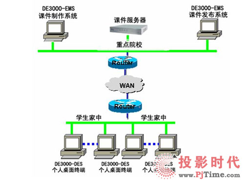 將全省各地市級院校與區(qū)縣級院;蛩搅⒃盒_B接起來,組成一個相對簡單卻有效的遠(yuǎn)程教育網(wǎng)絡(luò),使教學(xué)水平相對落后地區(qū)的學(xué)生能方便地享用遠(yuǎn)程教育網(wǎng)所提供的優(yōu)秀教育資源,通過實(shí)時授課、課件學(xué)習(xí)等方式極大的方便學(xué)生學(xué)習(xí),提高成績。考慮到區(qū)縣級院校的教學(xué)水平和經(jīng)費(fèi)問題,可以在各地市級院校配置CNKaran的DE3000-UES遠(yuǎn)程教育產(chǎn)品。而在區(qū)縣級院校只配置一臺PC加攝象頭,來實(shí)現(xiàn)遠(yuǎn)程授課或遠(yuǎn)程教學(xué)培訓(xùn)。