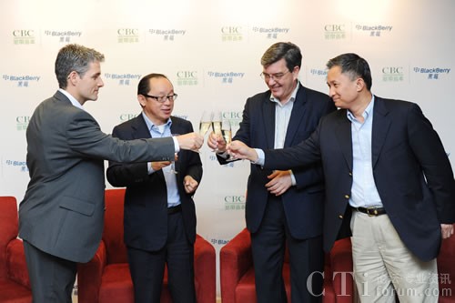 從左到右為:Marc Faucher(黑莓合作伙伴基金合伙人),田溯寧先生(CBC寬帶資本創(chuàng)始人),謝國(guó)睿先生(RIM中國(guó)區(qū)總裁),許志明先生(CBC寬帶資本投資團(tuán)隊(duì)成員)