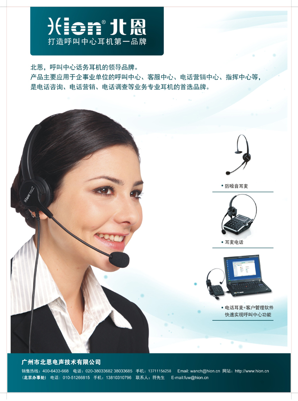 目前北恩Hion耳機(jī)品牌已覆蓋全球市場(chǎng),在北京、上海、廣州、深圳、鄭州、南京設(shè)有售后服務(wù)中心,并在北美、歐洲、南亞等擁有核心合作伙伴。產(chǎn)品主要應(yīng)用于電信、金融、電視購(gòu)物、物流等客服中心以及總機(jī)接線員、指揮中心、呼叫中心等,是電話咨詢、電話營(yíng)銷、電話調(diào)查等業(yè)務(wù)專業(yè)耳機(jī)首選產(chǎn)品。北恩采用最先進(jìn)耳機(jī)生產(chǎn)技術(shù),制造世界一流的通信耳機(jī),全力打造呼叫中心話務(wù)耳機(jī)第一品牌。