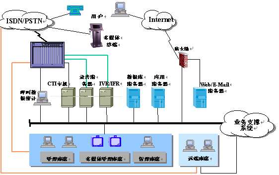 系統(tǒng)主要組成部分有呼叫匯接平臺、語音/傳真服務(wù)平臺、座席應用平臺、Internet服務(wù)平臺、數(shù)據(jù)支撐平臺、網(wǎng)絡(luò)支撐平臺。