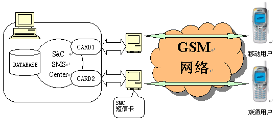 采用短信卡方式的短信系統(tǒng)結構如下圖,短消息通過內(nèi)置PCI短信卡發(fā)送,通過靈活多變的接口,與其他系統(tǒng)集成,組成短信應用系統(tǒng)。