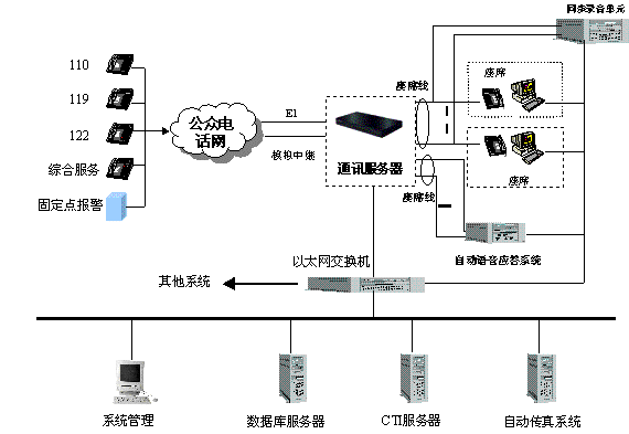 綜合接警平臺主要由hxd09可編程智能語音交換機(jī)和計(jì)算機(jī)網(wǎng)絡(luò)兩部分組成,交換機(jī)負(fù)責(zé)110、119、122報(bào)警電話的接入與分流及調(diào)度呼出等功能;計(jì)算機(jī)網(wǎng)絡(luò)則完成110、119、122報(bào)警信息的顯示、數(shù)據(jù)儲存、統(tǒng)計(jì)及信息查詢、發(fā)布功能。