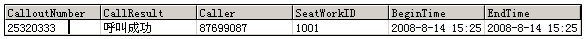 當(dāng)座席E1呼入時(shí), 接收主叫號(hào)碼(87699078), 同時(shí)發(fā)出呼叫(主叫號(hào)碼為87699078,被叫為25320333),并通過(guò)預(yù)測(cè)撥號(hào)識(shí)別各類(lèi)呼叫結(jié)果,如:忙音、空號(hào)、或無(wú)人接聽(tīng)等,只將有效的通話轉(zhuǎn)接至業(yè)務(wù)人員,同時(shí)將呼叫結(jié)果寫(xiě)入數(shù)據(jù)庫(kù)UT_IMCALL表(如下圖),