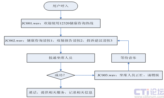 流程圖表示了正常工作期間的流程,實際技術(shù)流程會因為是否在工作時間、坐席人員是否繁忙等多種因素考慮,設(shè)置自動語音內(nèi)容、語音留言等功能。