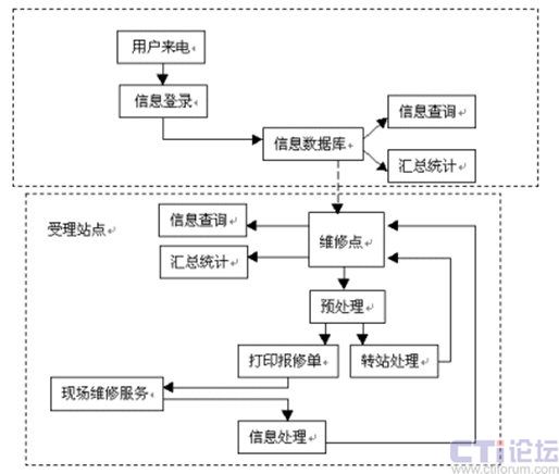 維修點對用戶的報修情況進行預處理之后,根據(jù)用戶所在的區(qū)域,分配至最近距離的維修站,將用戶與其報修信息即時轉(zhuǎn)移,這也就是圖中所顯示的"轉(zhuǎn)站處理"。之后,維修站將直接打印出報修單,加快服務實施的效率、減少人工出錯的比例,有專業(yè)人員及時上門服務檢修。