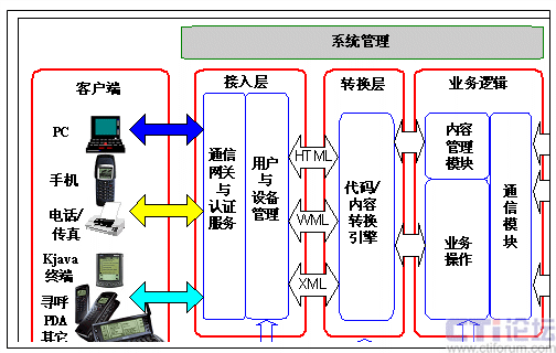 系統(tǒng)支持多種接入設(shè)備,包括廣泛使用的Web瀏覽器、支持WAP或HDML的移動電話、支持Kjava的移動終端、基于PalmOS或WinCE的PDA(個人數(shù)字助理)、傳統(tǒng)的移動電話和尋呼等,并可以方便對于未來的接入設(shè)備進行定制。