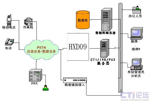 “系統(tǒng)”主要由以下幾部分組成:HXD09語音交換機(jī)、CTI Server服務(wù)器、數(shù)據(jù)庫系統(tǒng)、業(yè)務(wù)處理系統(tǒng)以及座席(業(yè)務(wù)代表)、呼叫管理系統(tǒng)、呼叫監(jiān)控系統(tǒng)幾項(xiàng)業(yè)務(wù)組成。